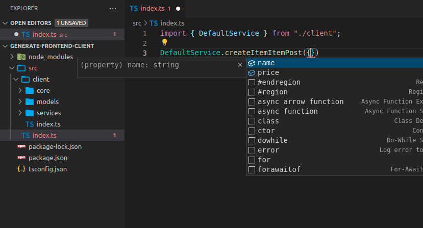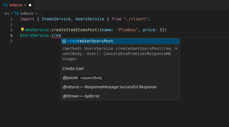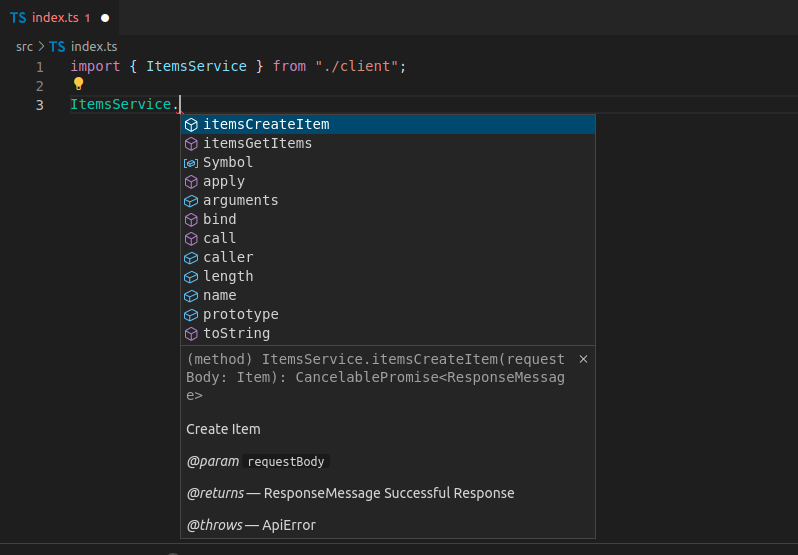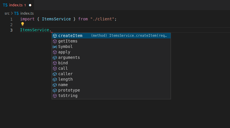 现在您可以导入并使用客户端代码,它可能看起来像这样,请注意,您可以为这些方法使用自动补全: